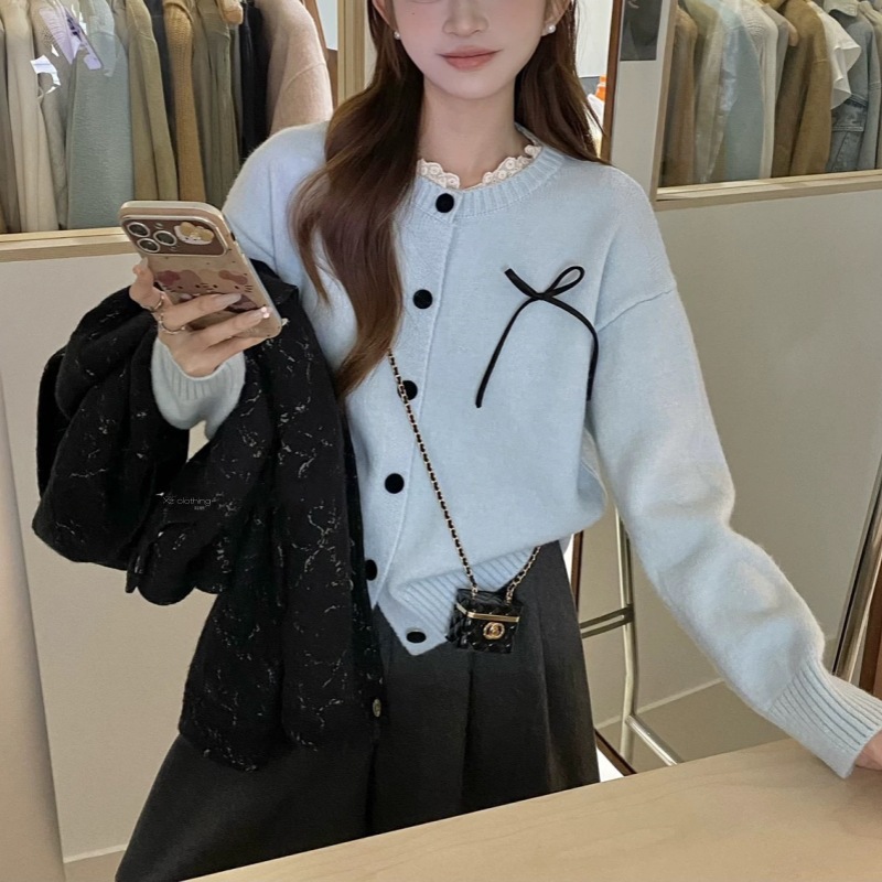 胸元の愛らしいリボン刺繍と襟元のフリルが特徴的なニットカーディガンです。