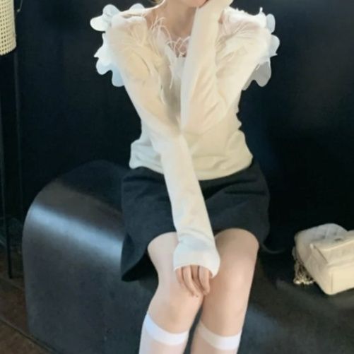 透け感のあるチュール素材にふんわりとしたフリルをあしらい、女性らしさを引き立てます。