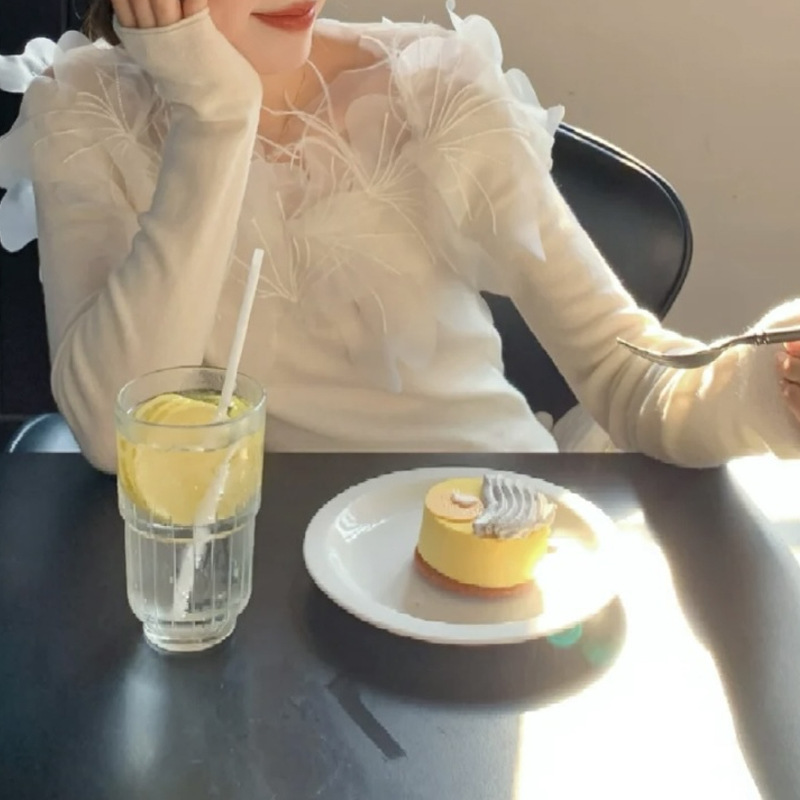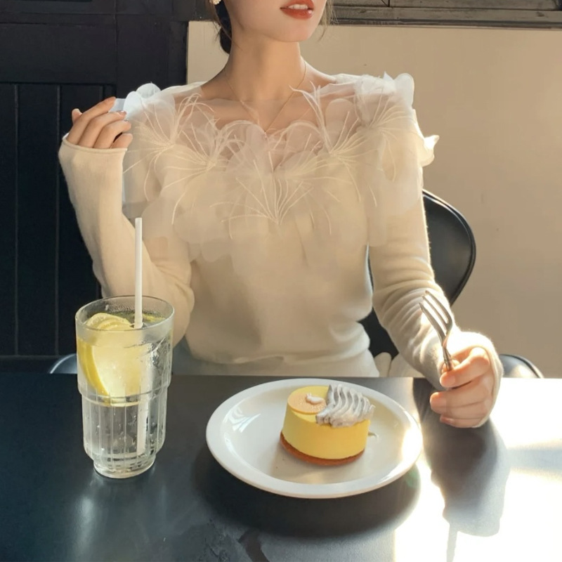 胸元と肩部分に施された繊細な立体花柄刺繍が目を引く、華やかなニットトップスです。