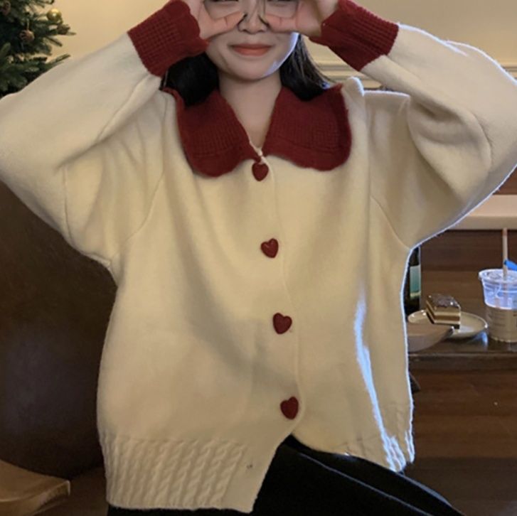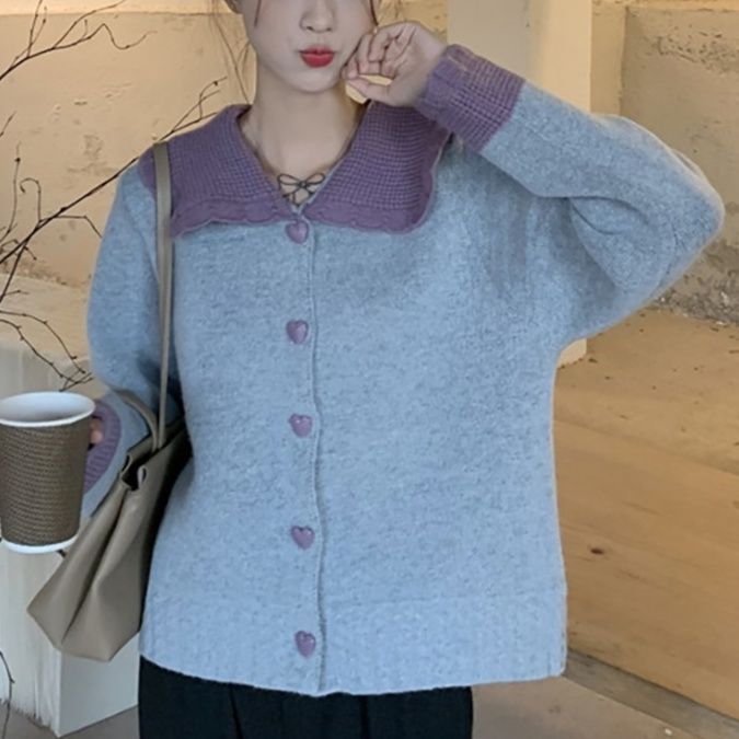 レトロな雰囲気が魅力的な襟付きのニットカーディガンです。
