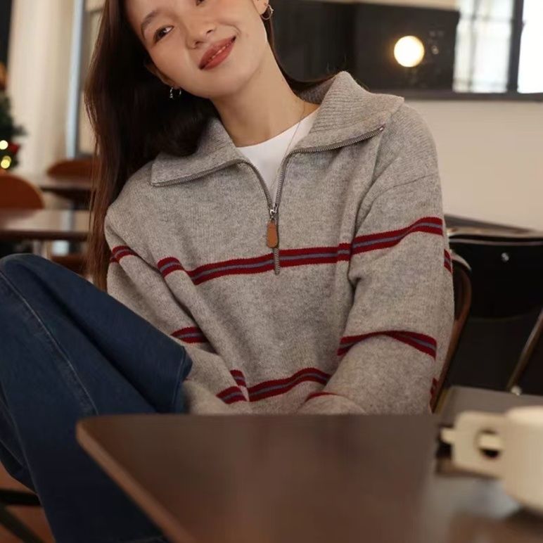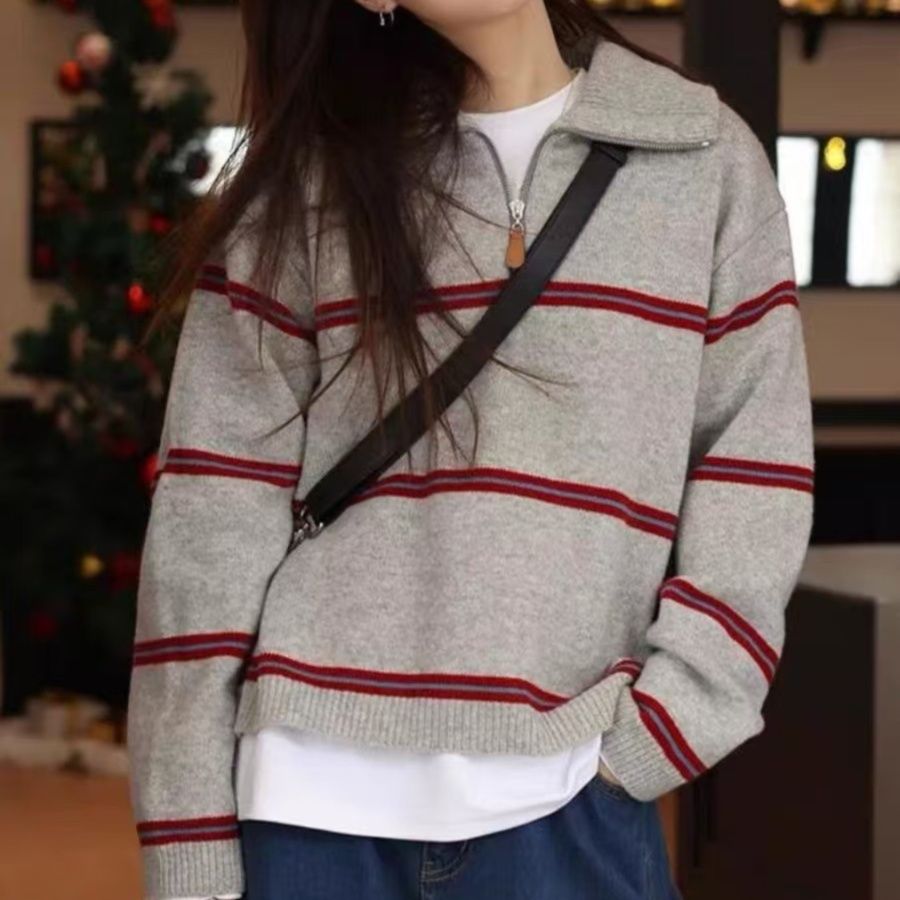 カジュアルな装いに上品さを添える襟付きデザインのニットセーターです。