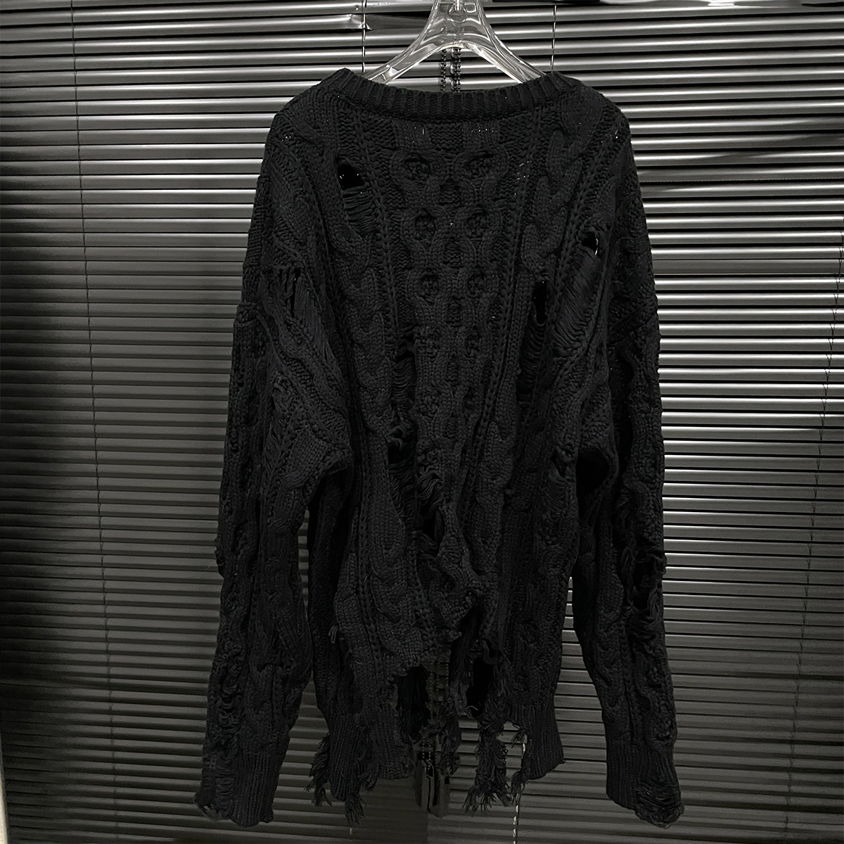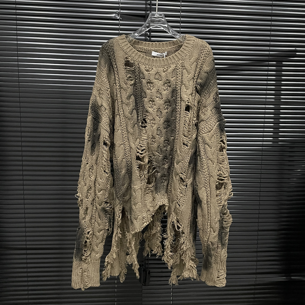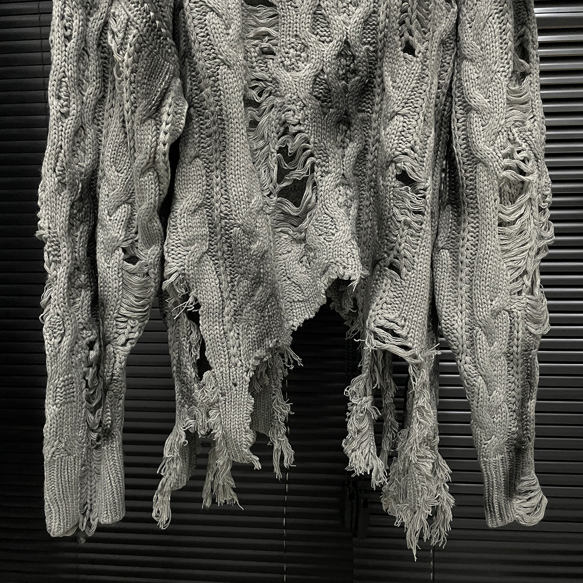 大胆なダメージ加工が印象的なケーブル編みのニットセーターです。