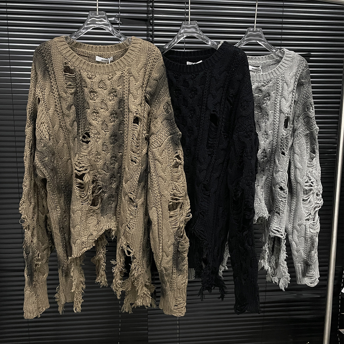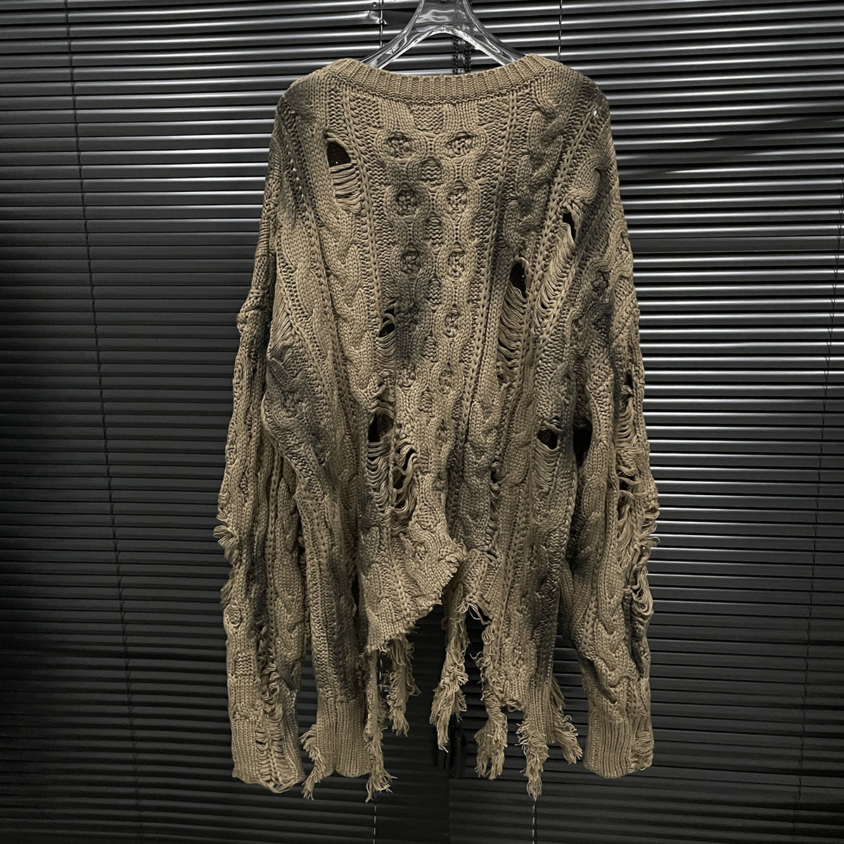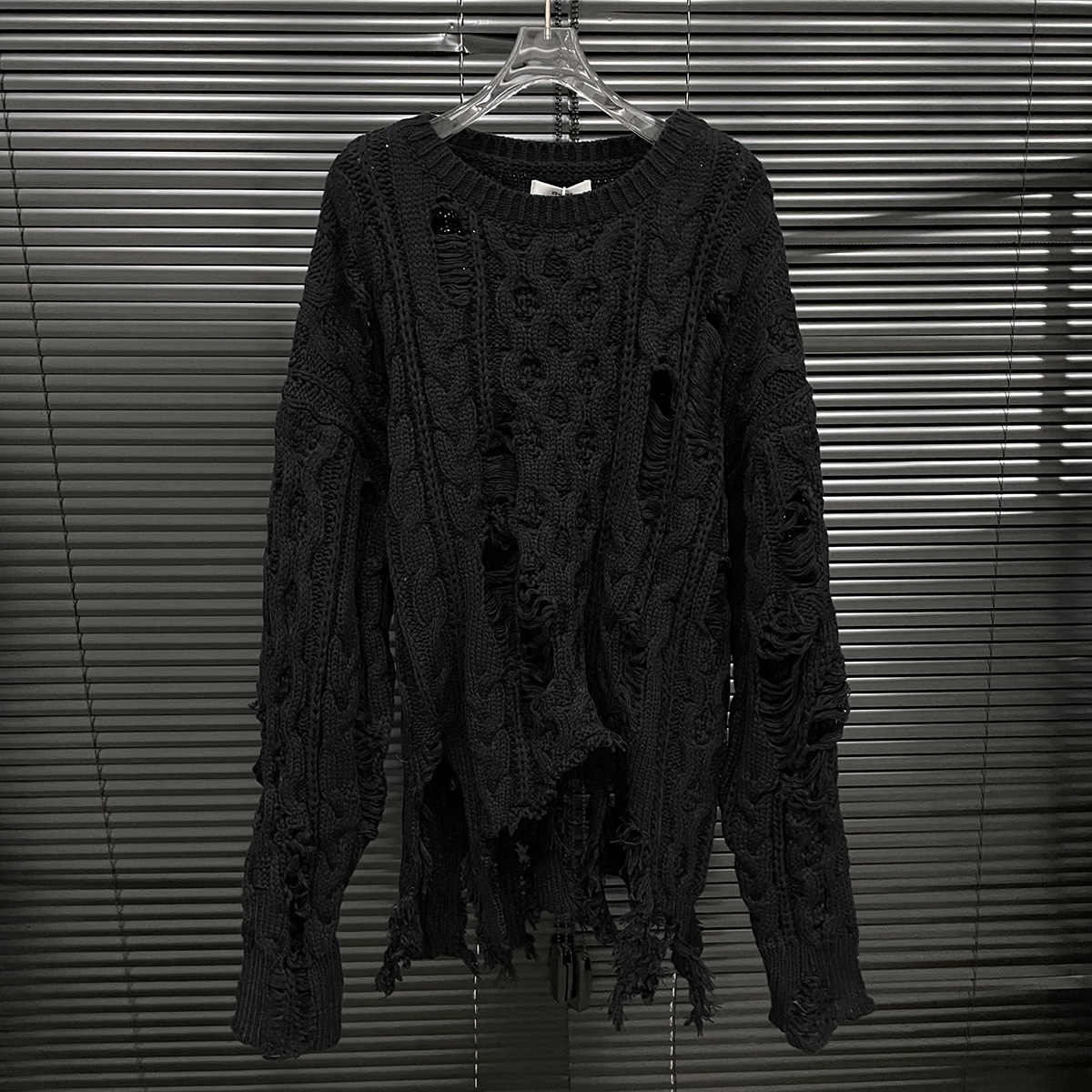 大胆なダメージ加工が印象的なケーブル編みのニットセーターです。