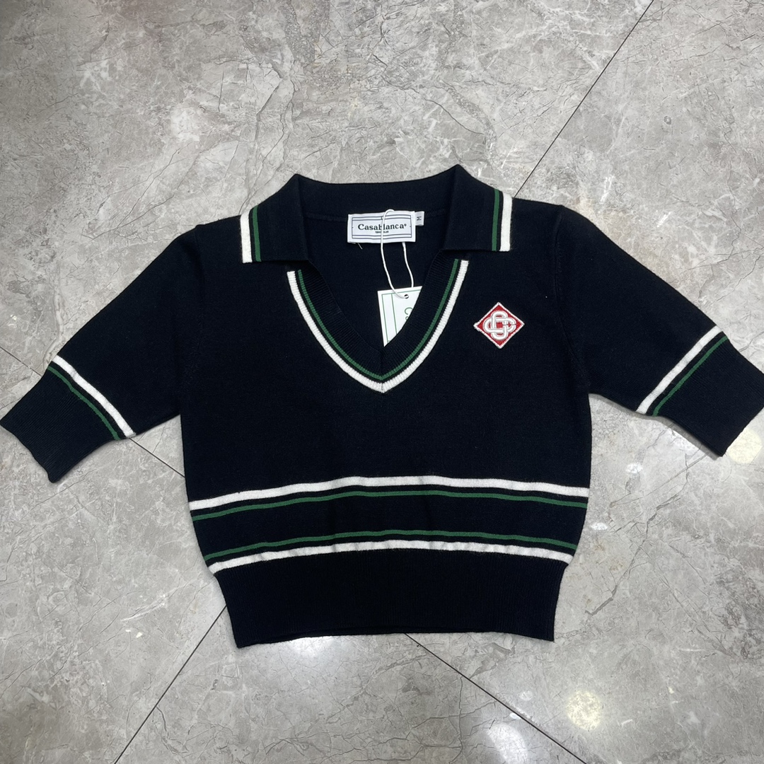 襟付きの半袖トップスはブイネックデザインで、裾と袖口にマルチボーダーラインをあしらいました。