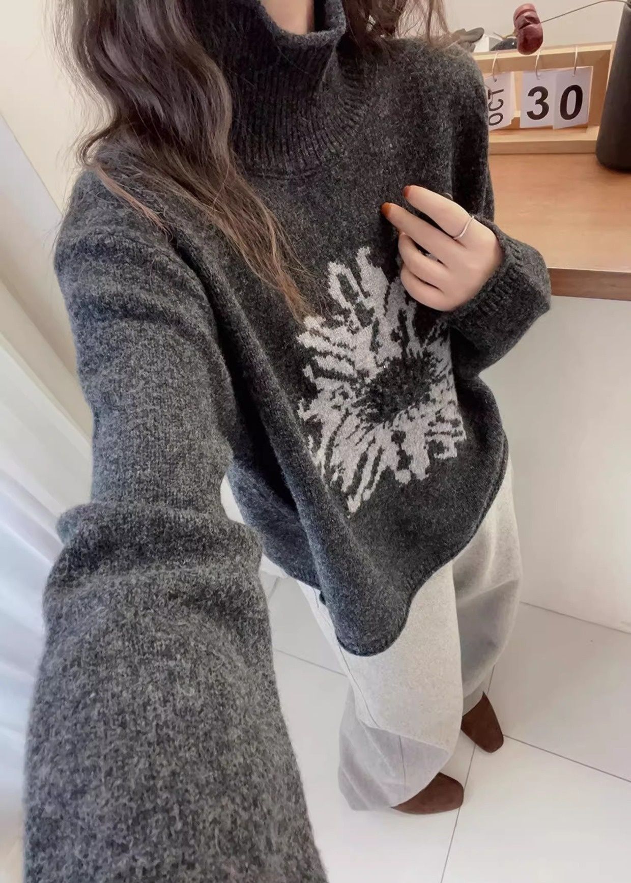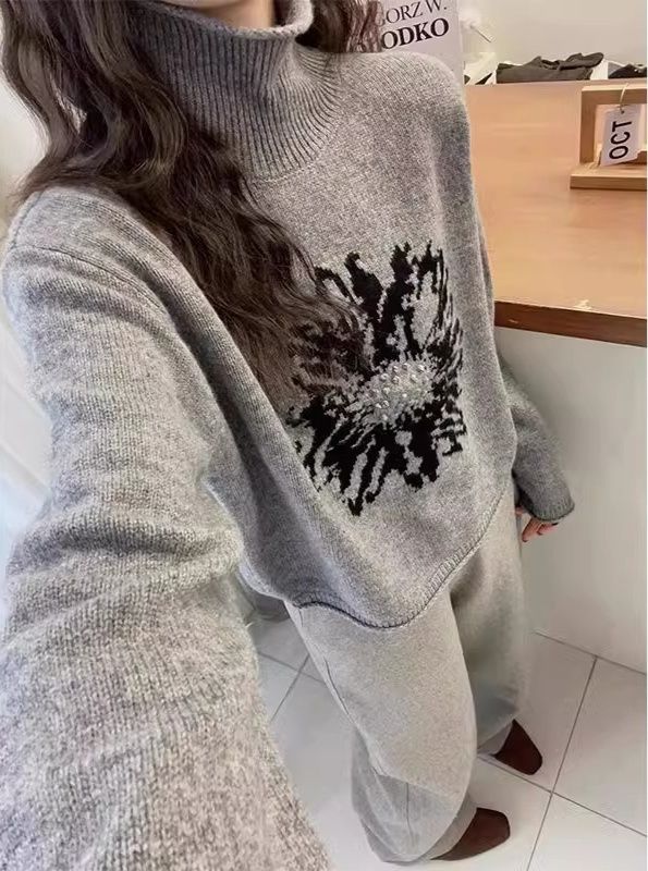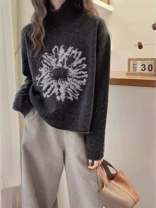胸元に大きく施された花柄の刺繍が目を引くタートルネックセーターです。