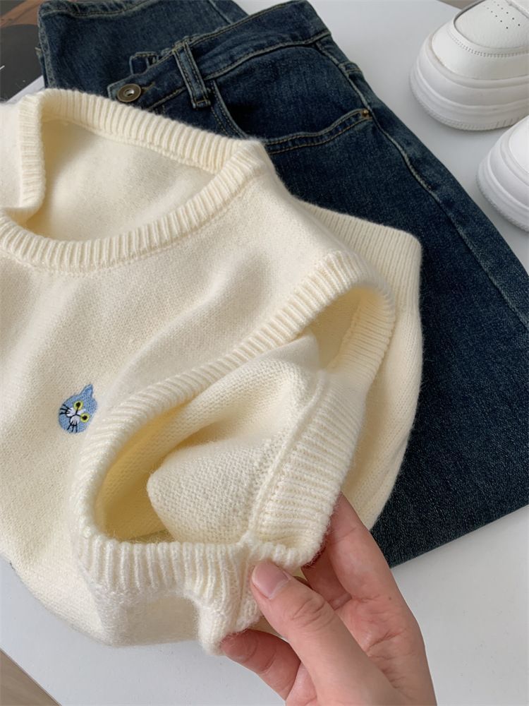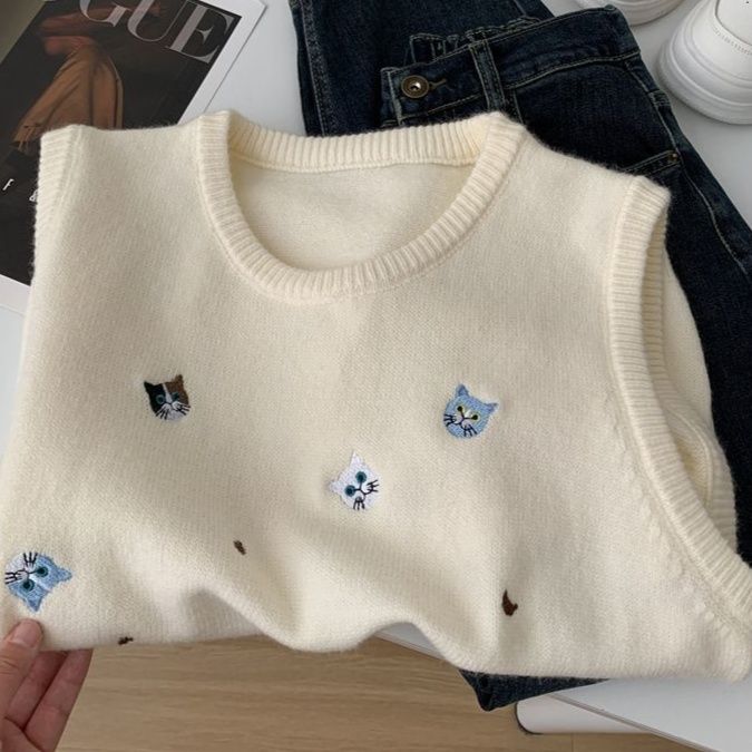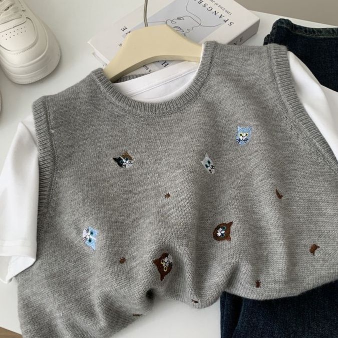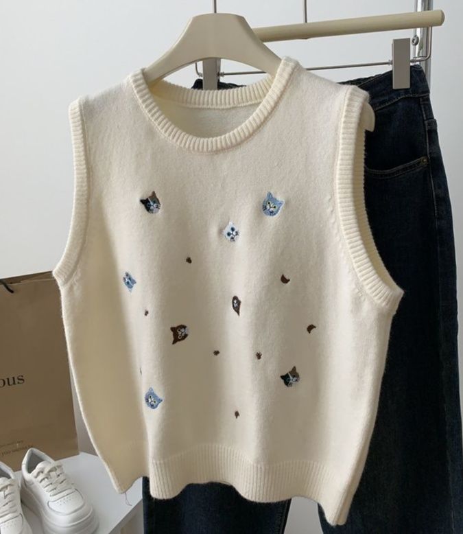 胸元に散りばめられた小さな花の刺繍が愛らしいニットのベストです。