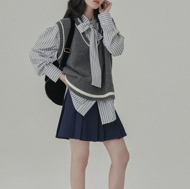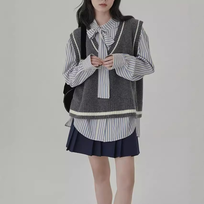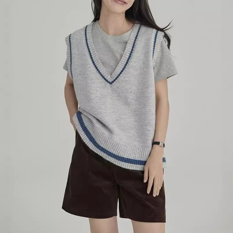 学院風スタイルを演出する深めのブイネックが特徴的なニットベストです。